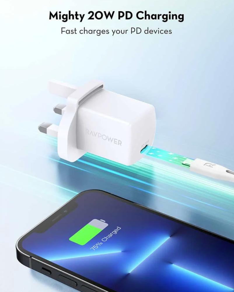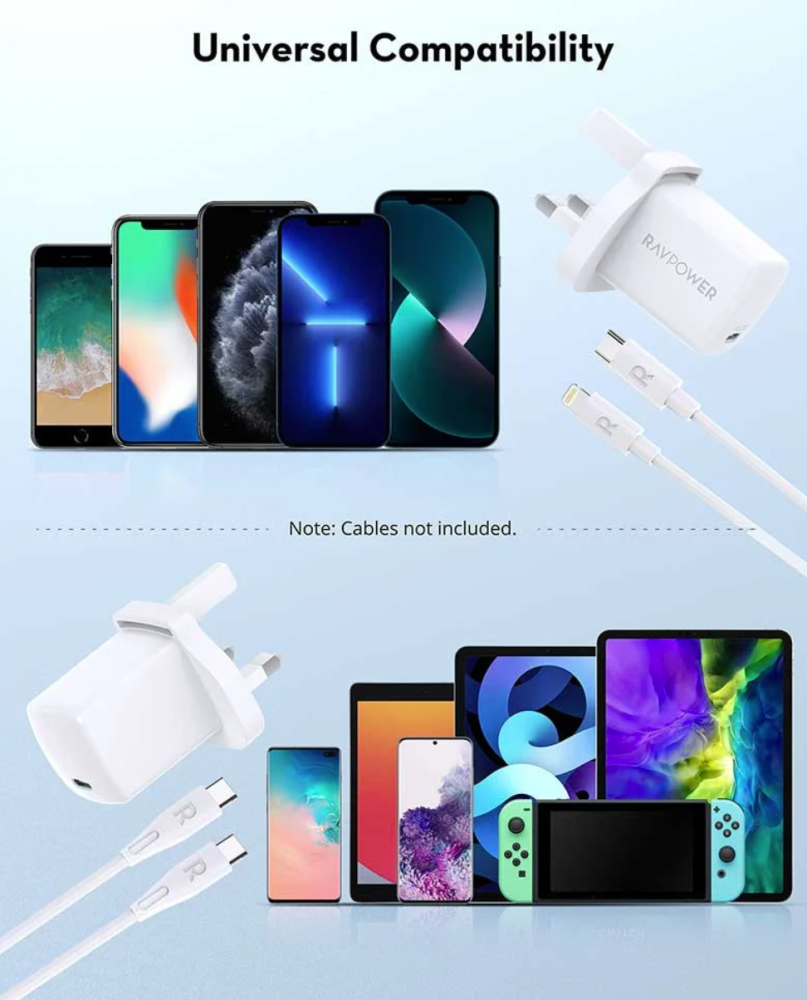شاحن الحائط راف باور PD باونير متوافق عالميًا مع مجموعة واسعة من الهواتف الذكية والأجهزة اللوحية والمزيد.