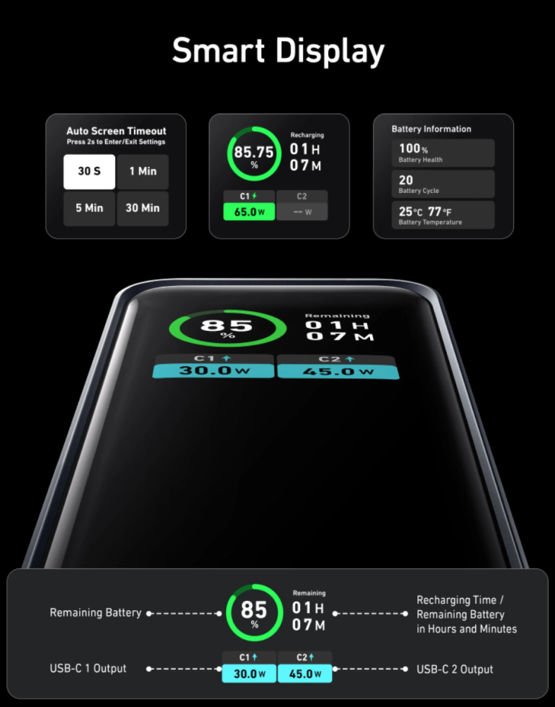 استمتع براحة الشحن السريع ثنائي الاتجاه مع قوة تصل إلى 130 واط، في حين يدعم كل منفذ USB-C واحد إخراج وادخال أقصى قدره 65 واط للشحن الفعال.