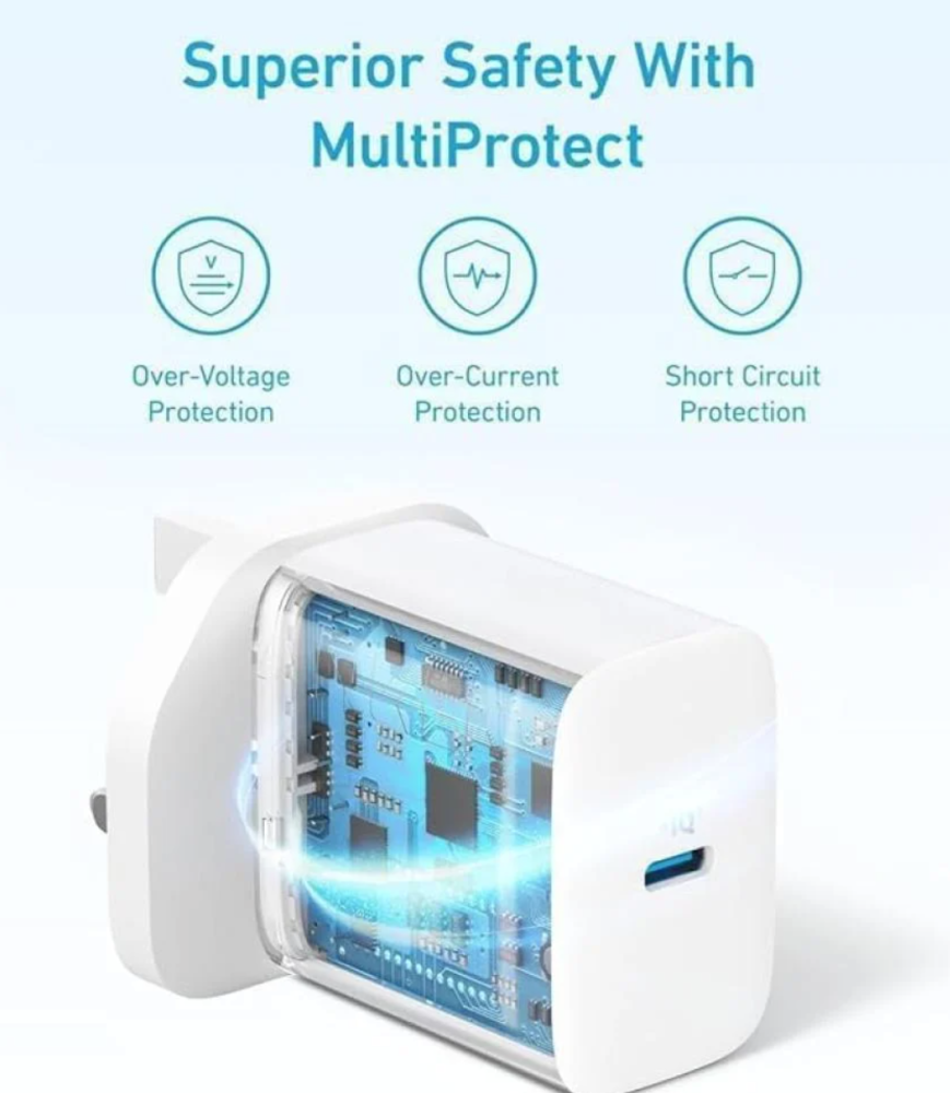 يعد شاحن أنكر 20W USB-C مع كابل Type-C بطول 1.5 متر الخيار المثالي لشحن الأجهزة المحمولة بسرعة وكفاءة. يوفر الشاحن وكابل USB-C المرفق طاقة تصل إلى 20W، مما يتيح لك شحن آيفون 14 حتى 50% في 30 دقيقة فقط. يتميز الشاحن بتصميم أنيق ومدمج يوفر المساحة، مما يجعله مناسبًا للاستخدام اليومي أو السفر. كما أن نظام MultiProtect للحماية يضمن سلامة جهازك من المخاطر المحتملة مثل التيار الزائد والسخونة الزائدة، مما يوفر تجربة شحن آمنة وسريعة.