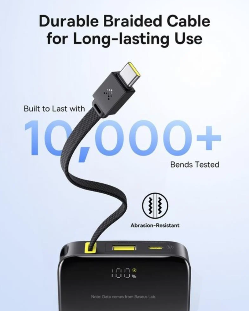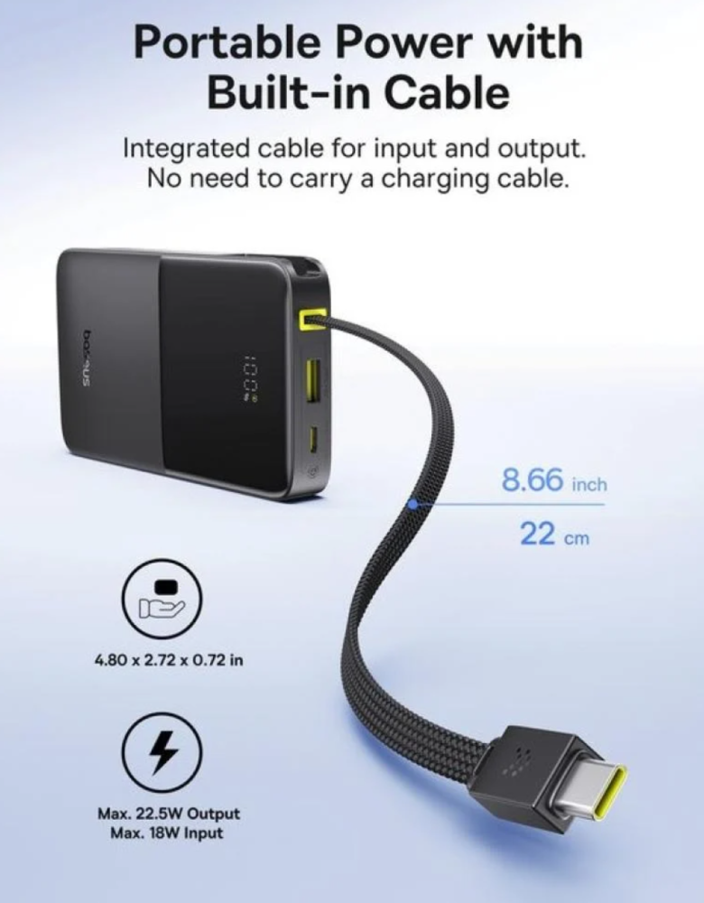 بيسوس - بطارية متنقلة بقدرة 10000ملي امبير بقوة 22.5 واط مع سلك تايب سي مدمج وشاشه رقمية ومنفذ يوا اس بي وتايب سي - اسود