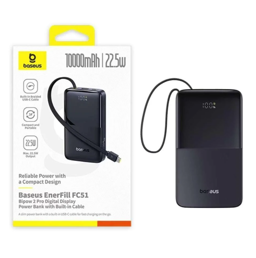 باور بانك بيسوس بسعة 10000 مللي أمبير هو الحل المثالي للشحن أثناء التنقل. تصميمه الصغير والخفيف يجعله سهل الحمل في الجيب، ويتميز بسلك تايب سي مدمج بقوة شحن 22.5 واط لتوفير أداء سريع وفعال. مزود بشاشة رقمية لعرض نسبة البطارية المتبقية بدقة، بالإضافة إلى منفذ تايب سي ومنفذ USB لتعدد خيارات الشحن.