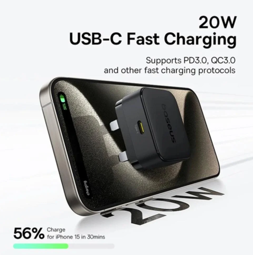 بيسوس - فيش جداري بقوة 20 واط بمنفذ تايب سي بخاصية الشحن السريع - اسود