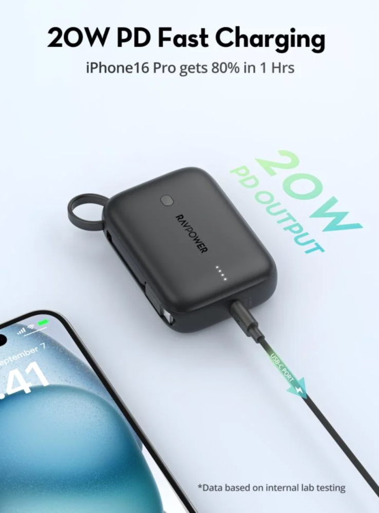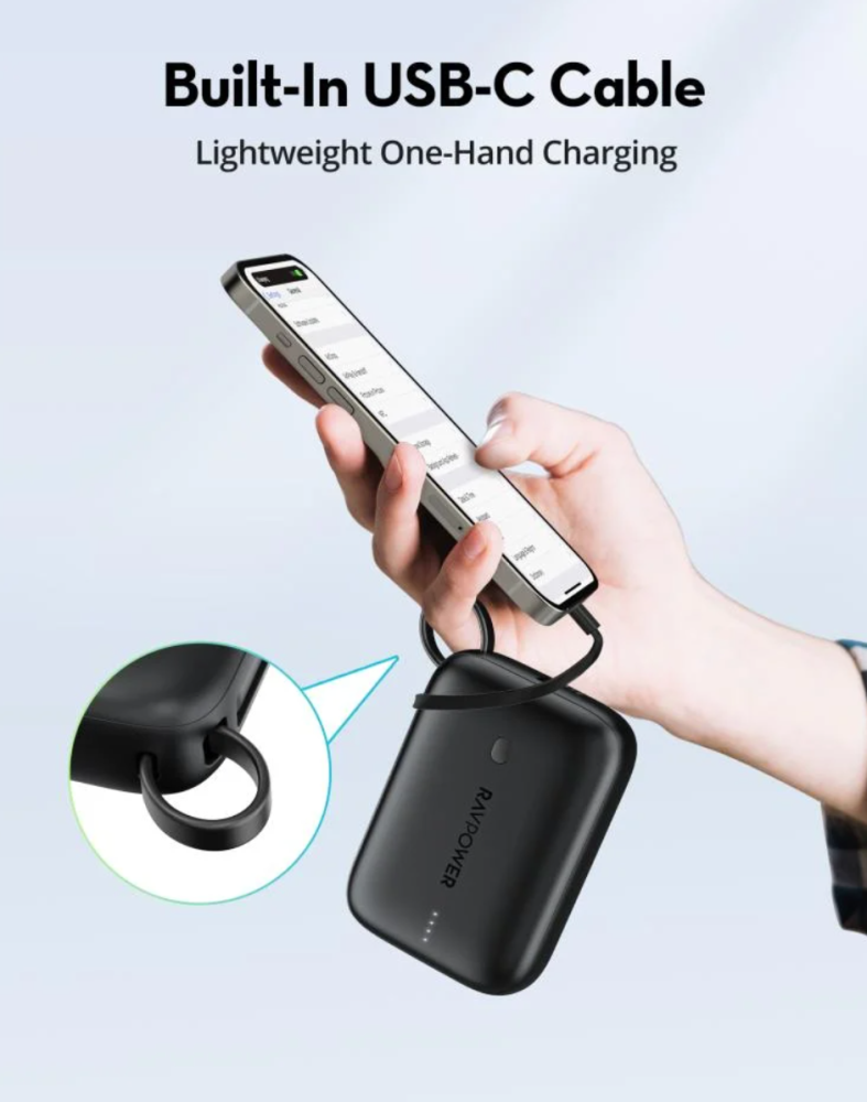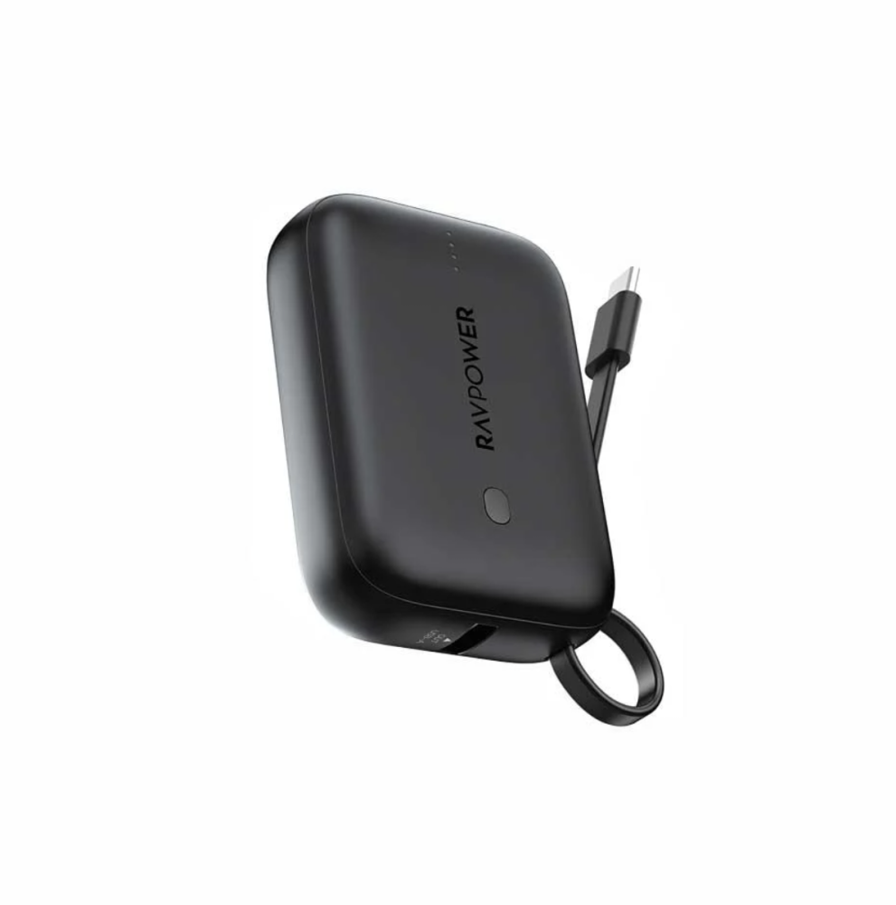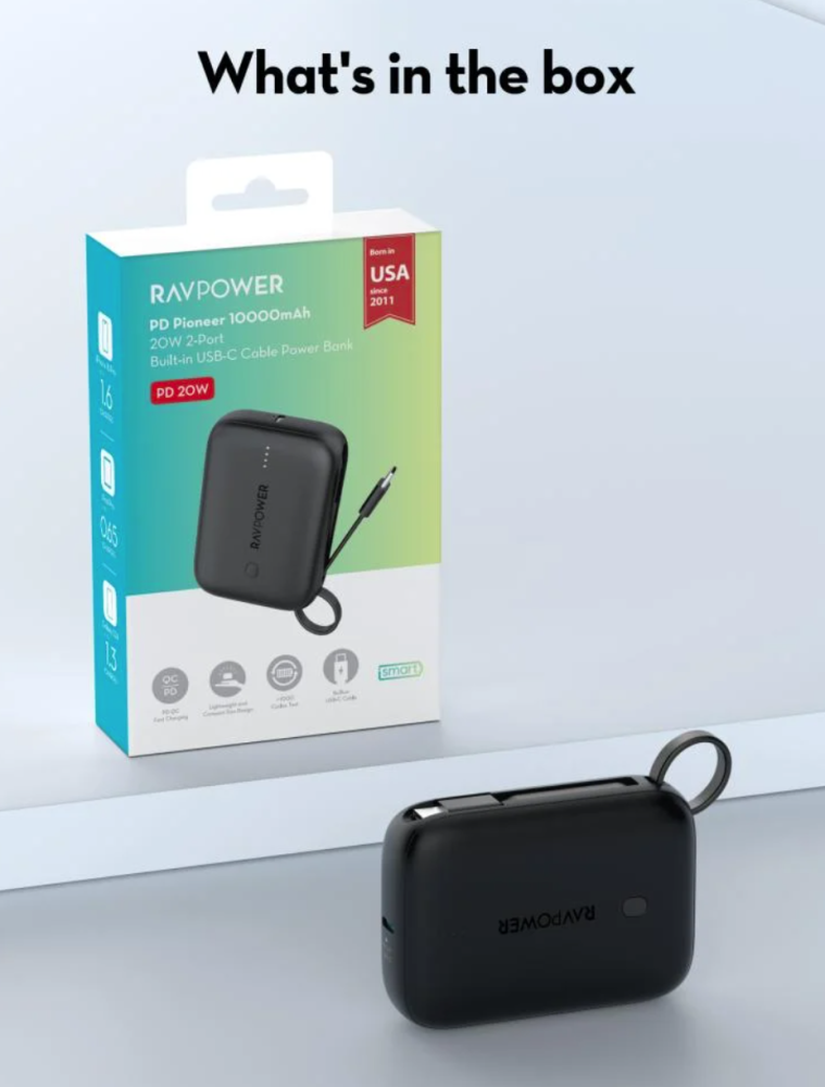 بطارية راف باور نحيفة بقوة 20 واط بسعة 10000 ملي امبير مع سلك مدمج تايب سي ومنفذ تايب سي ومنفذ يو اس بي - اسود