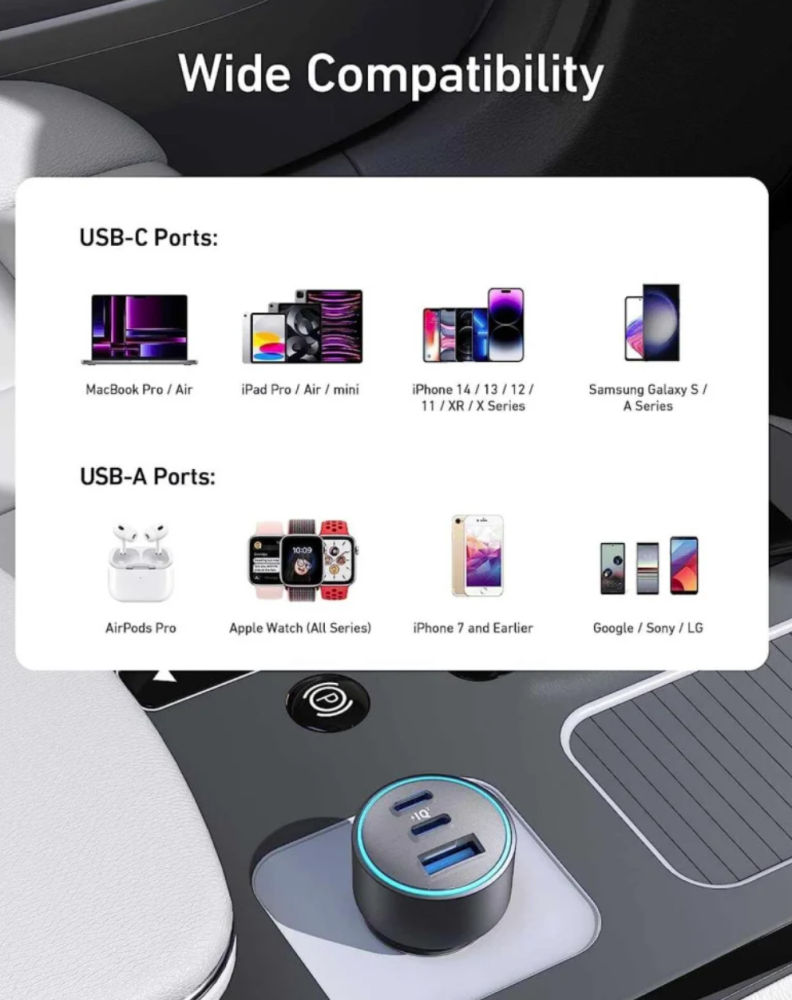 سهل التنقل ولا ياخذ مساحة في السيارة وايضا يوجد به ميزة مراقبة الحرارة الذكية اللي تمنع ارتفاع حرارة الشاحن بشكل متواصل.