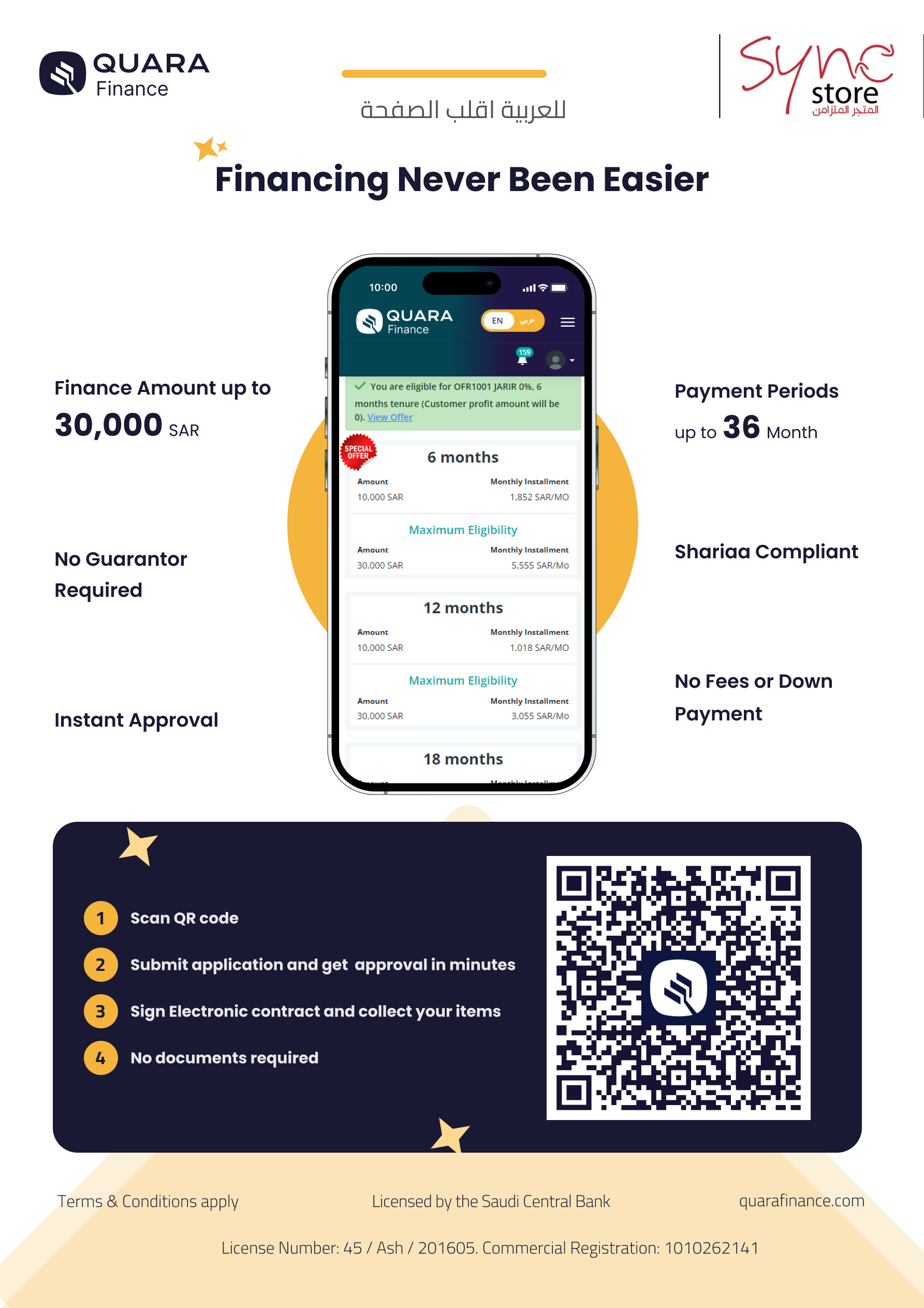 يمكنك الآن اسوق براحة وبإجراءات سريعة وسهلة (بدون دفعة أولى أو كفيل)، وبخطط سداد مرنة تناسب إمكاناتك .