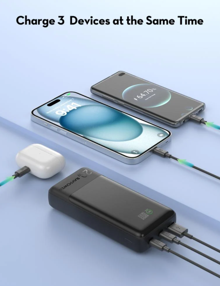 - قدرة على شحن 3 أجهزة في وقت واحد، مما يوفر الراحة أثناء التنقل.
