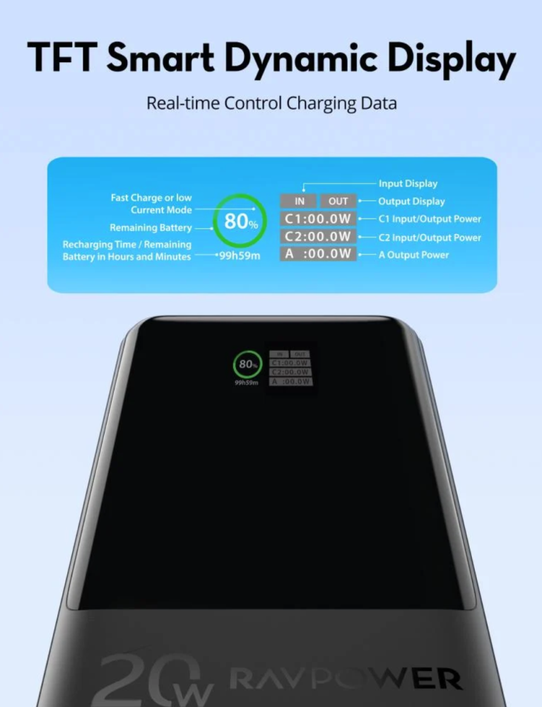 بطارية متنقلة راف باور بقوة 20 واط بسعة 20000 ملي امبير بمنفذين تايب سي ومنفذ يو اس بي مع شاشة عرض - اسود